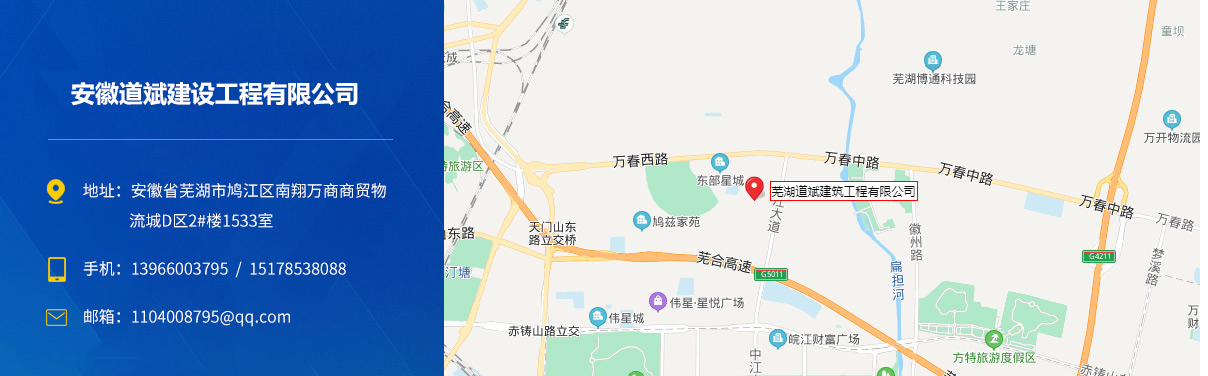 安徽道斌建設工程有限公司成立于2018年4月,主要從事工程施工、工程勞務、鋼結構施工、市政公用施工,市政施工總承包貳級、地基基礎工程專業(yè)承包貳級、防水防腐保溫工程專業(yè)承包壹級、鋼結構工程專業(yè)承包貳級、建筑裝修裝飾工程專業(yè)承包貳級、建筑工程施...